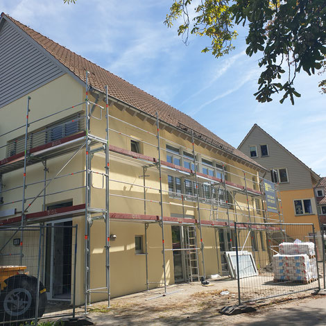 Es geht weiter mit der Baustelle. Noch steht ein Gerüst am Gebäude, in das die Küchenwerkstatt einziehen wird. Aber, außen ist die neue Farbe angebracht und innen sind alle Leitungen verlegt. Bald wird der Estrich eingebracht und dann kommen die Fliesen.